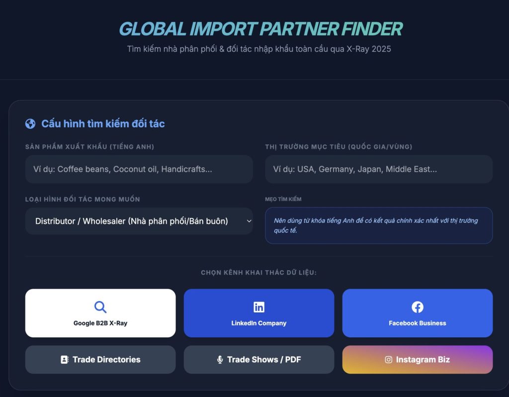 Bạn là nhân viên Sales Logistics đang “đau đầu” vì thiếu data khách hàng chất lượng? Logistics Lead Hunter chính là giải pháp đột phá năm 2025, giúp bạn truy vết chính xác các chủ hàng (XNK) thông qua dữ liệu hải quan và công nghệ X-Ray độc quyền.