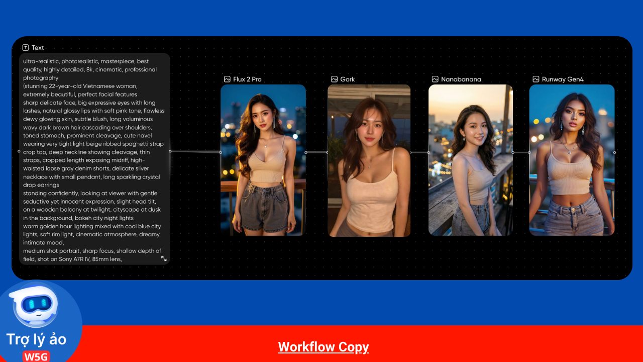 Tại mỗi bước của Workflow, hãy chỉ định mô hình AI chuyên biệt nhất cho tác vụ đó nhằm tối ưu chất lượng đầu ra. Nếu cần mô phỏng người thật, bạn có thể chọn các model tối ưu hóa cho việc tạo hình nhân vật thực tế (Realistic human modeling); hoặc nếu cần làm video ngắn từ ảnh tĩnh, hệ thống cũng có sẵn mô hình tương ứng. Việc tinh chỉnh Prompt ở mỗi Node giúp kiểm soát AI bám sát chặt chẽ kịch bản và ý đồ thiết kế.