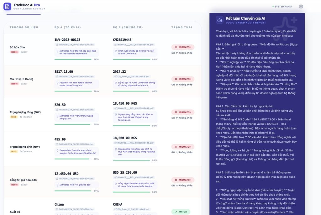 Đây là tính năng đáng giá nhất của TradeDoc AI Pro. Dựa trên logic nghiệp vụ hải quan, AI sẽ đưa ra một báo cáo Logic-based Audit Report: